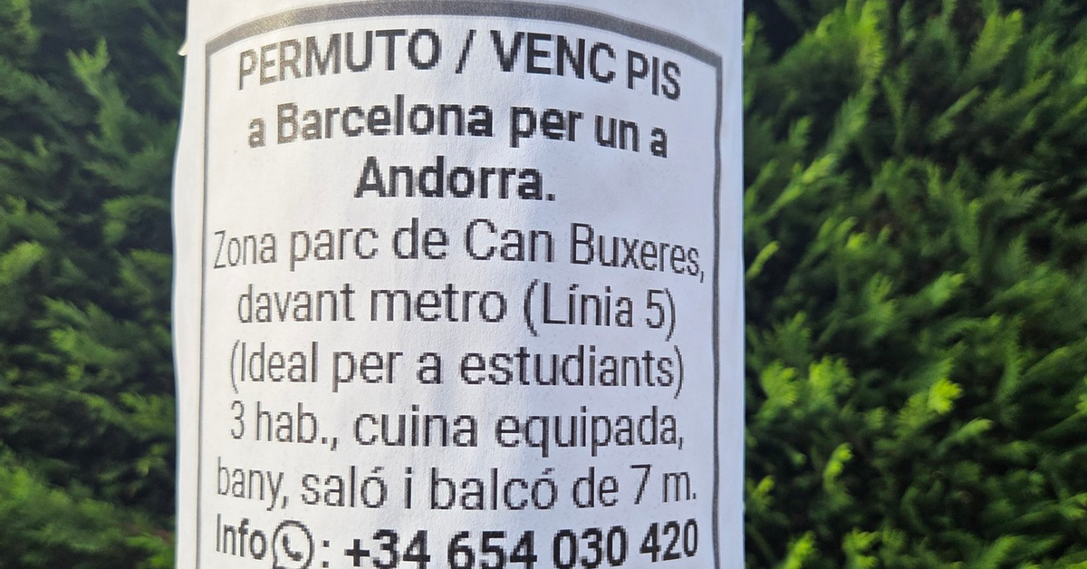 (Fotonotícia) El cartell penjat al carrer que ven un pis a Barcelona "per un a Andorra"
