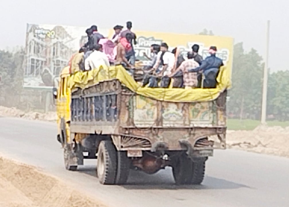 ঝুঁকি নিয়ে পণ্যবাহী ট্রাকের ডালায় ঘরমুখী নিম্ন আয়ের মানুষ