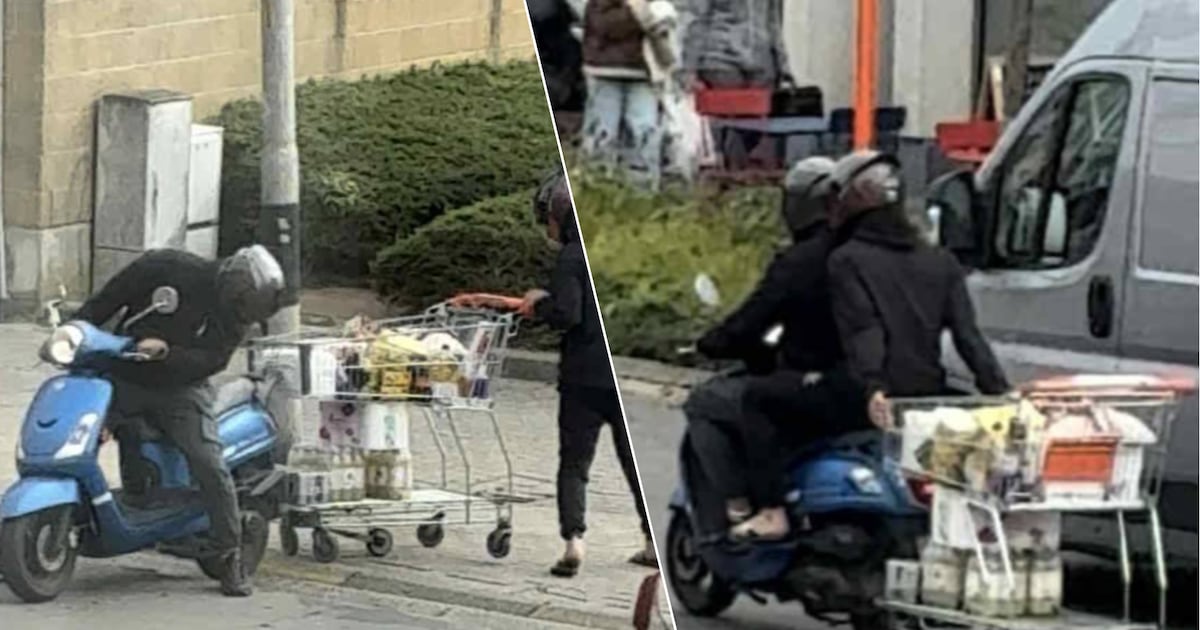 KIJK. Bromfietser haakt winkelwagen van Colruyt vast aan tweewieler en snort naar huis