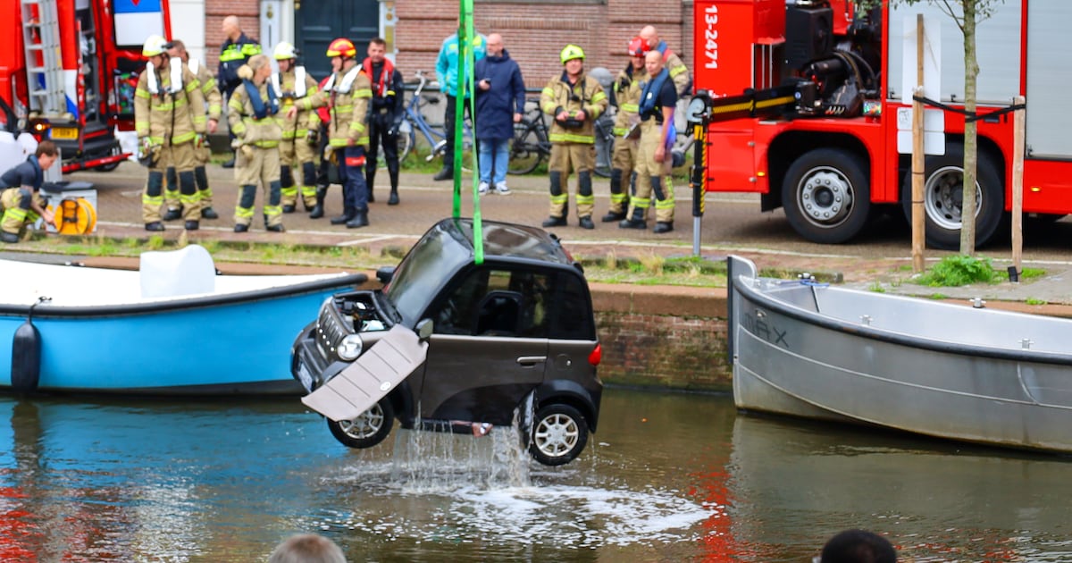 Moeder en kind rijden het water in met Biro in Amsterdam, omstanders springen in het water