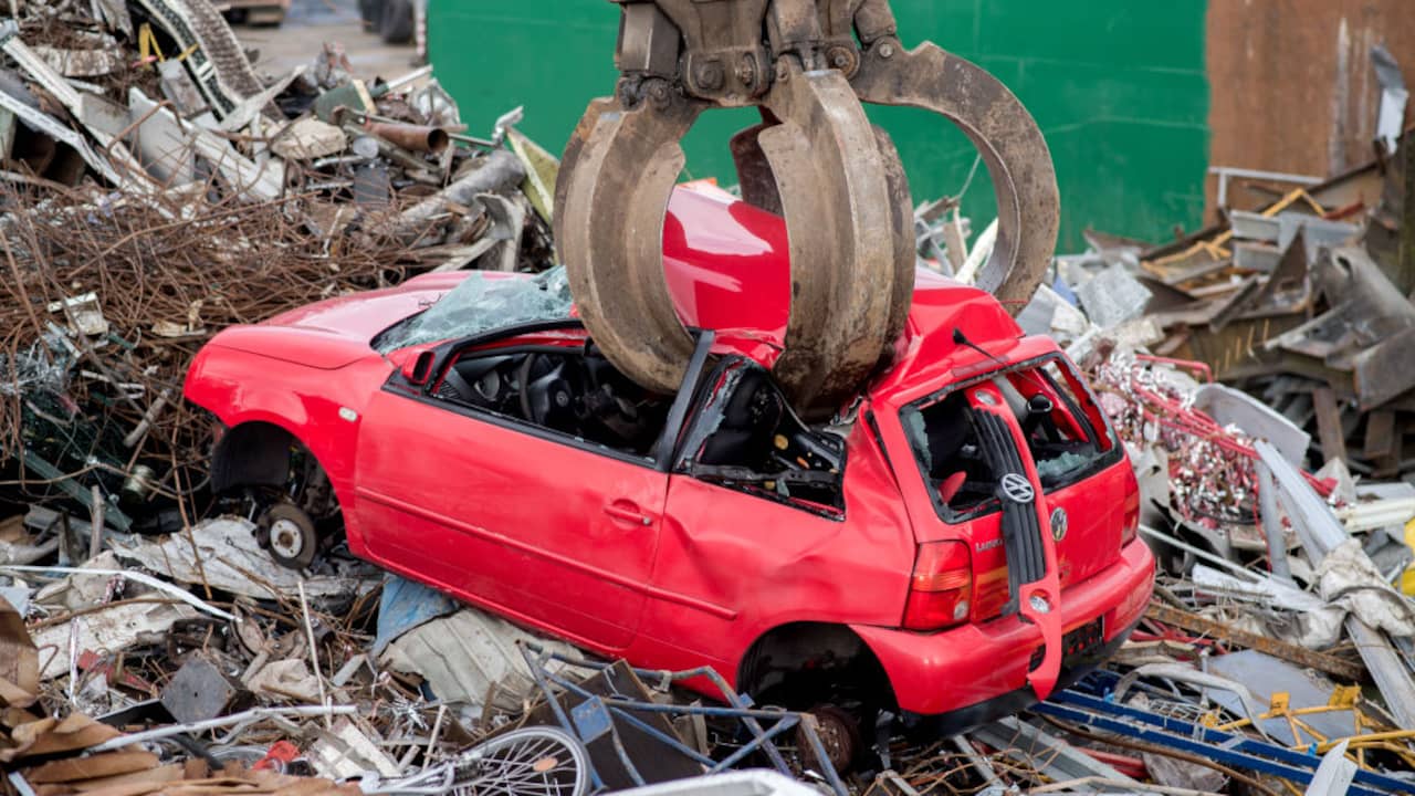 Kraanmachinist Duitse autosloperij ziet man in voertuig over het hoofd bij pletten