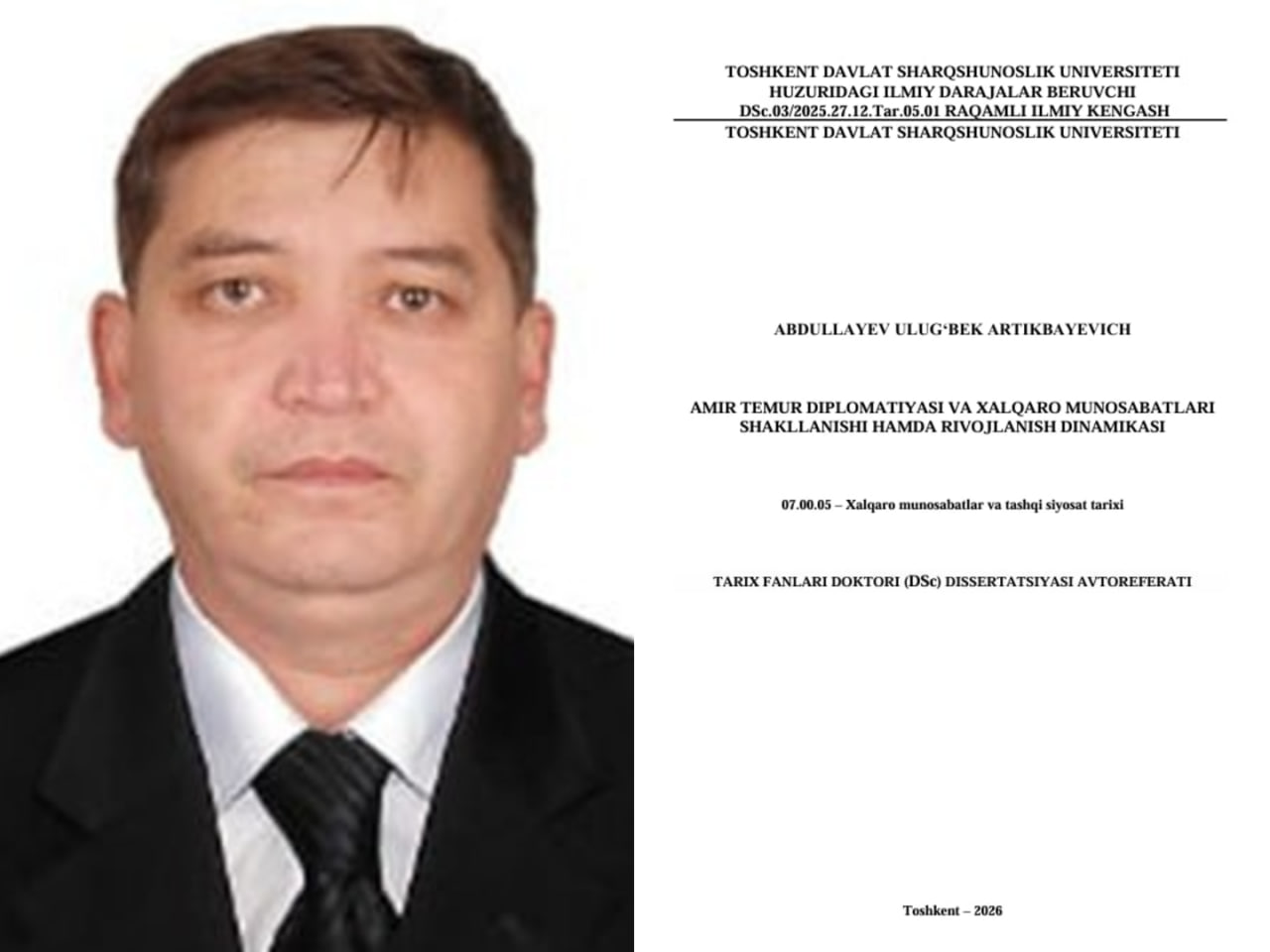 Abdullayev Ulugʻbek Artikbayevichning tarix fanlari doktori (DSc) dissertatsiya himoyasi eʼloni